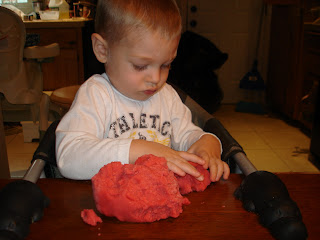 From there we did our morning Bible reading in Matthew and then I did some work on the computer while he sat under the computer table looking at alphabet flash cards and books. I decided it would be fun to do some more hands-on crafty activities today (especially since our weather took a turn for windy and rainy today). So, upon Roman's request to play with play dough I decided we should make some again, since the batch we made in January has long since molded and been thrown out!